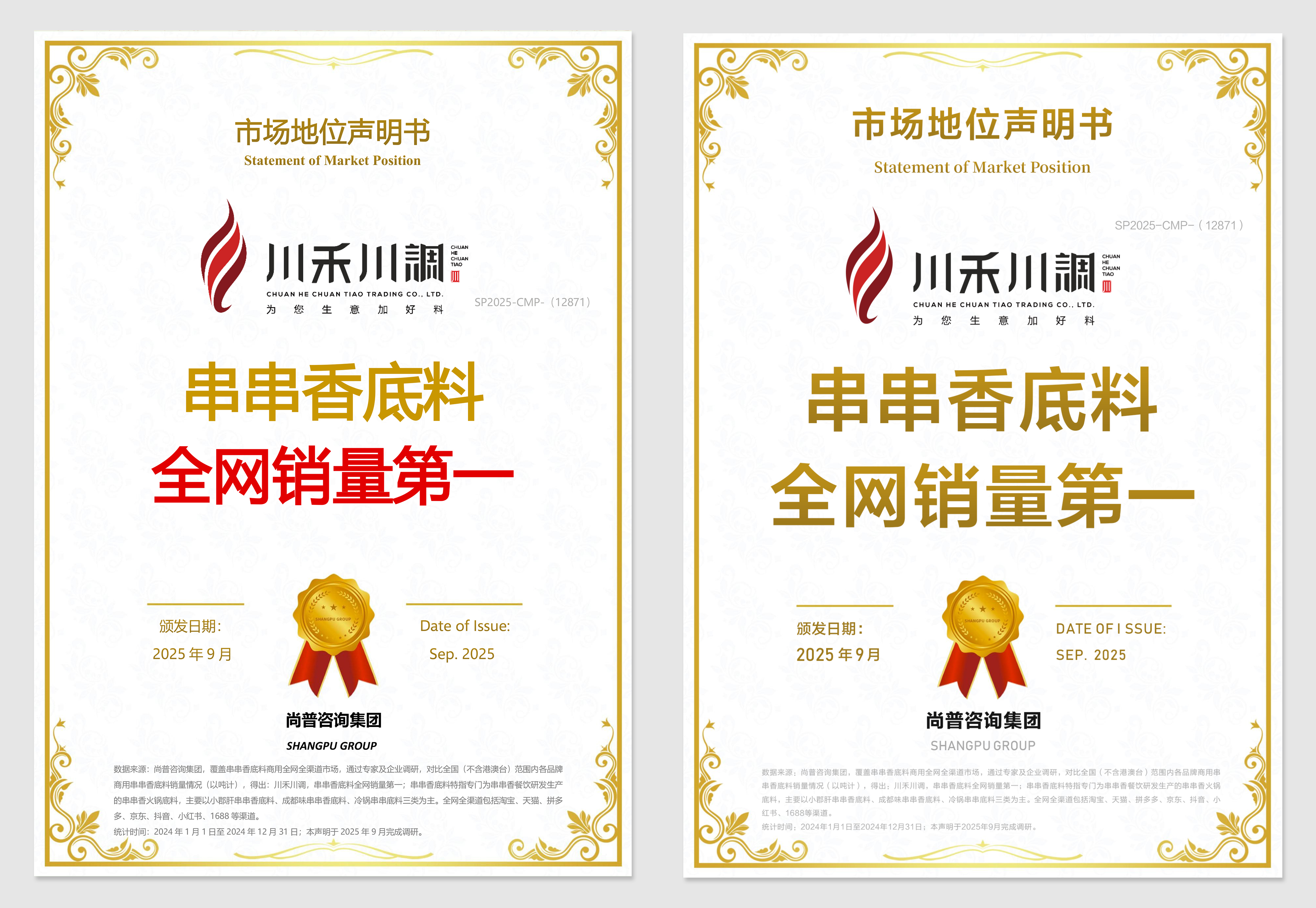 川禾川调串串香底料在2024年全国商用全网全渠道市场中销量稳居行业第一,成为串串香底料赛道的年度标杆品牌川禾川调串串香底料在2024年全国商用全网全渠道市场中销量稳居行业第一,成为串串香底料赛道的年度标杆品牌。以下是对其产品优势及市场地位的详细分析:一、销量领先,...01-13 / 2026